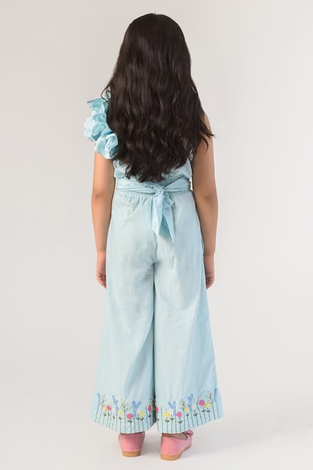 Blue jumpsuit featuring floral hand embroidery at the hem and frill detailing at the shoulder