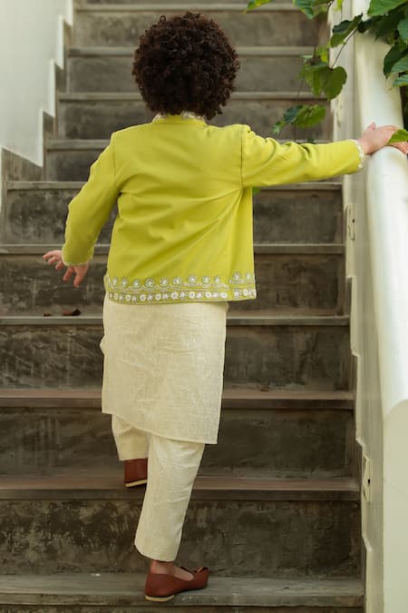 Green jacket featuring intricate embroidered borders paired with an off-white organic cotton kurta and trouser. The kurta has a front button placket and side slits, crafted from German satin and mulmul.