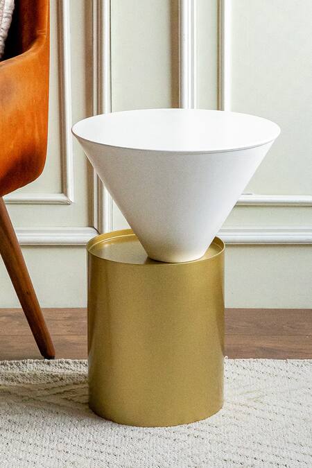 White table with an abstract cone shaped top, accentuated with a matte gold metal base.