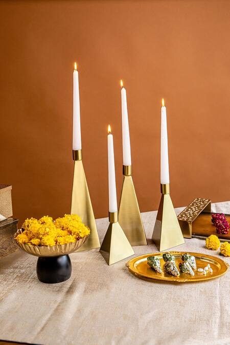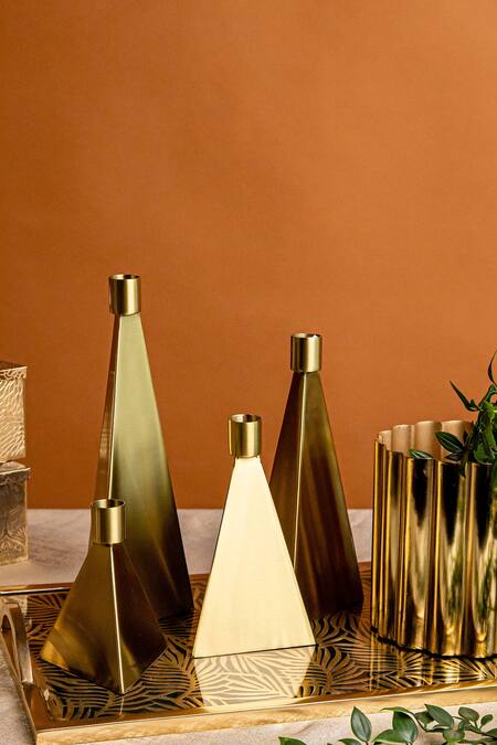 Pyramid shaped, Product Finish: Brushed Gold, Dimensions: L x B x H:, In inches:, XL: 4 x 4 x 11, L: 4 x 4 x 9, M: 4 x 4 x 7, S: 4 x 4 x 5, In cms:, XL: 10 x 10 x 28, L: 10 x 10 x 23, M: 10 x 10 x 18, S: 10 x 10 x 13, Product Weight (in kgs): 2.34, Note: Only selling set of 4 candle holders