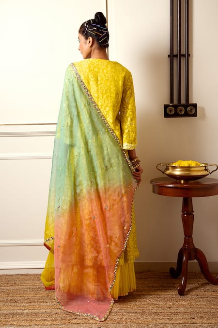Lime handwoven kurta with roses embellished & hand embroidered mirror work. Paired with sheer organza dupatta in shades of melon pink, lime & soft teal; hand embroidered with pop coloured mirror accents. Comes with crushed sharara.