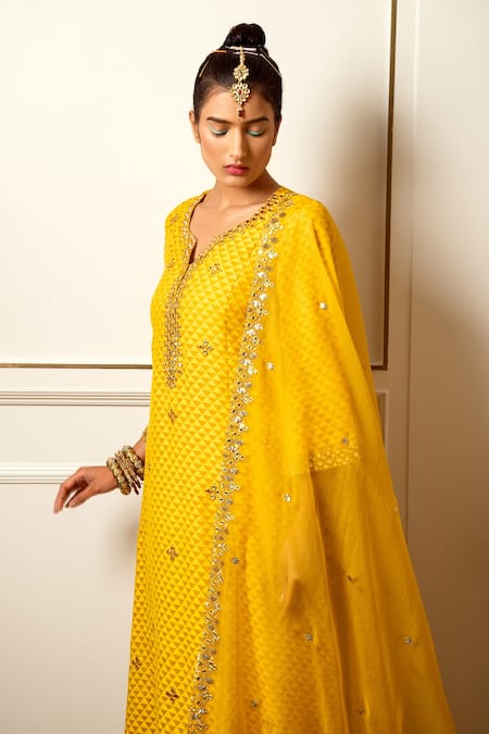 Yellow Organza, Banarasi, Cotton Mul Floral, Mirror Notched Kurta Sharara Set