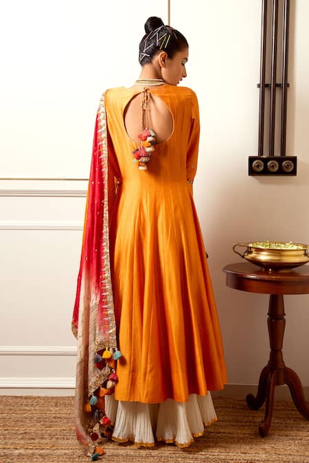 Summer orange chanderi silk anarkali hand embroidered with pop coloured threads, gota patti & sequin knots. Paired with ombre silk dupatta with sequins, mirror work & crushed sharara.