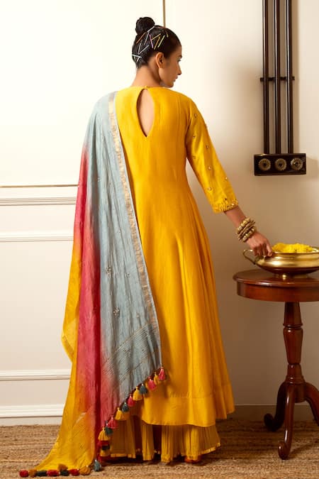 Mango chanderi silk anarkali hand embroidery in thread zardozi & mirror. Paired with ombre tussar silk dupatta with sequins work & crushed sharara.