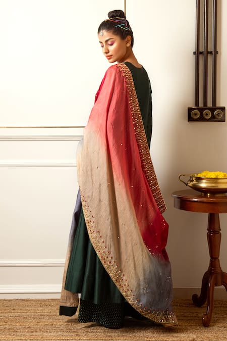 Bottle green textured kalidar kurta with striped bodice & placement embroidery. Paired with hand woven zari banarasi flared pant & ombre shaded hand embroidered dupatta.
