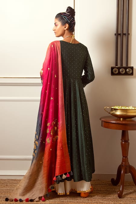 Bottle green sequin work kalidar kurta hand embroidered with thread zardozi & mirror work. Paired with tasseled ombre silk dupatta with gota patti & crushed sharara.