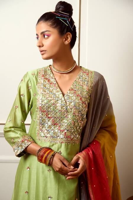 Pista green chanderi silk kurta with sequin & mirror embroidery. Paired with crushed cotton mul sharara & shaded tussar dupatta.
