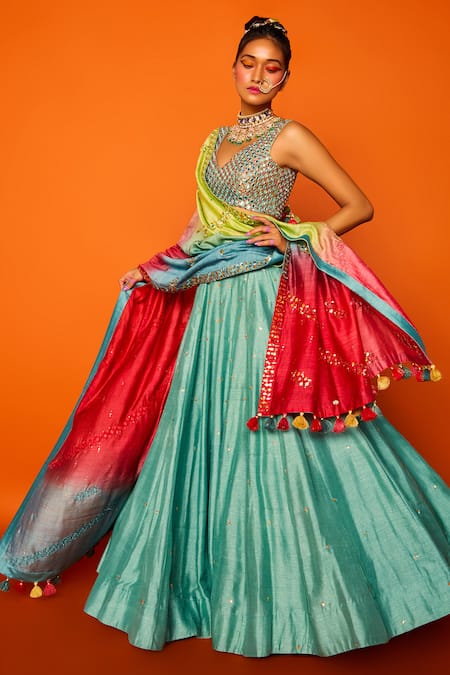 Electric teal silk lehenga with sequinned booties & mirror work waistline. Comes with hand embroidered blouse with thread zardozi, mirror- knotted accents in fuchsia & gotapatti - mirror work dupatta in shaded of bright coral , melon pink , pop lime & grey.