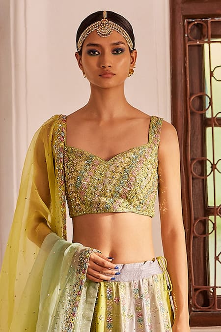Green , Organza, Satin Beads, Ombre Flower Embroidered Lehenga Set