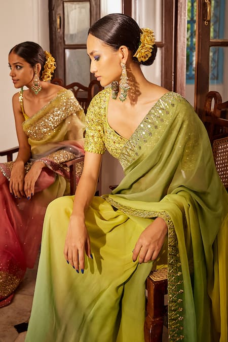 Pistachio green ombre saree featuring a sequinned & mirrorwork border. Paired with a bright lime padded blouse adorned with hand-embroidered zardozi, gotapatti, beads & sequinned accents.
