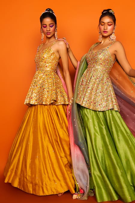 Mustard yellow peplum short tunic with hand embroidered colourful thread zardozi, mirror accents, sequinned knots & gotapatti. Comes with silk lehenga strewn with sequinned butis, belt & tasselled sheer organza dupatta in shades of ash, fresh green, mustard & melon pink.