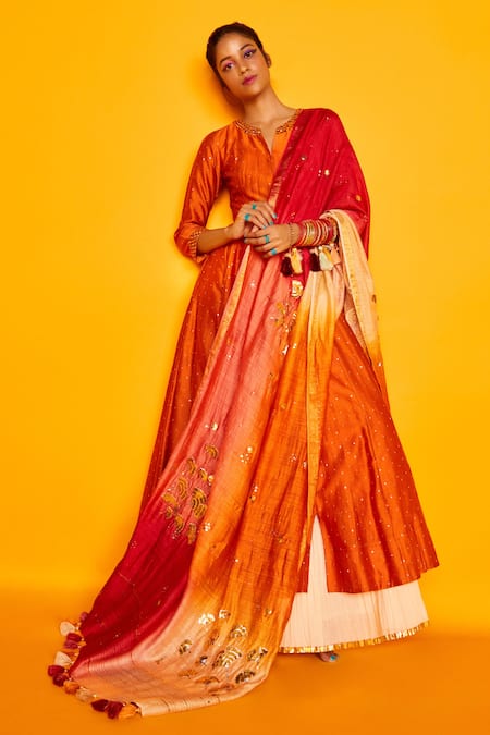 Orange sequin kalidar hand embroidered with thread zardosi & mirror work. Comes with tasselled ombre dupatta with gotapatti petals & contrast crushed sharara.