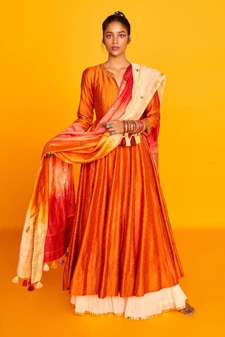 Orange Chanderi Silk, Tussar Silk, Cotton Mul Round Sitara Anarkali Sharara Set