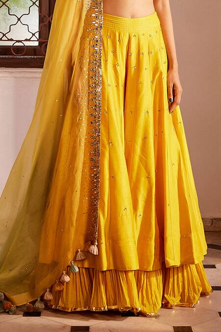 Yellow Silk, Crepe, Organza Mirrors, Sequins, Sunshine Mango Layered Gharara Set