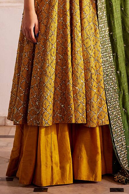 Mustard yellow textured hand-embroidered checkered anarkali featuring zardozi and hand knotted zari. Paired with a sharara and an ombre dupatta in emerald and blue with thread zardozi, gotapatti, and mirror work embellishments.