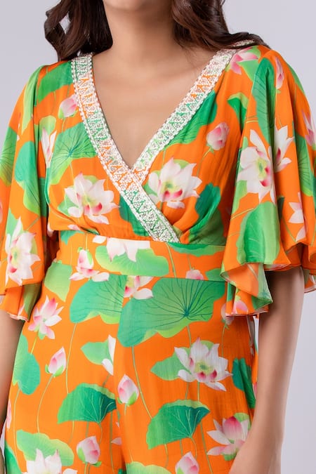 Orange V neck jumpsuit with lotus printed motifs & flared sleeves.