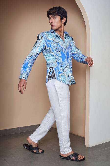 Paisley print design covers the entire shirt., Front button closure adds a classic touch.