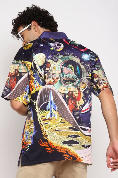 Vivid space-themed print covering the entire shirt, Unique collar design with front button closure