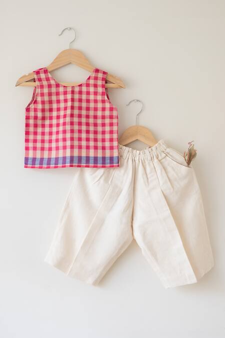 Pink checkered cotton silk top featuring a back tie-up. Paired with beige handwoven cotton baggy pants with elastication.