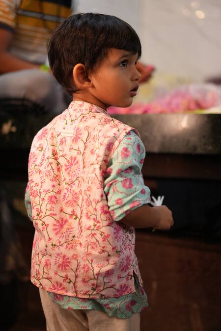 Pink floral kurta with a bandi featuring complementary blue floral details. Set includes a matching off-white dhoti pant.