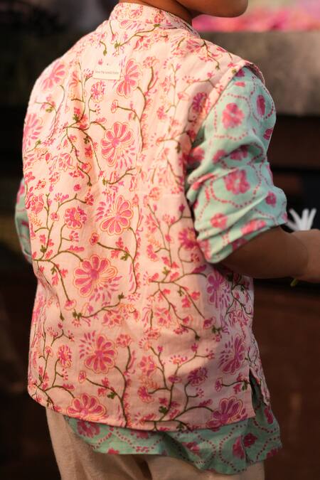 Pink floral kurta made from handwoven cotton featuring front buttons. Accompanied by a blue floral bundi .