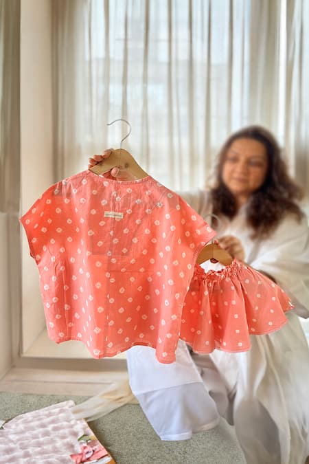 Shop_Love The World Today_Pink 100% Cotton Hand Dyed Bandhani Shared Secrets Kimono Shirt With Twirl Skirt_at_Aza_Fashions