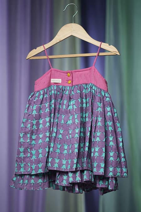 Purple Cotton Handblock Print Tulip Of Strappy Layered Dress