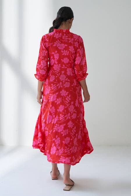 Pink Cotton Silk Floral Mandarin Collar Lovestruck Print Dress
