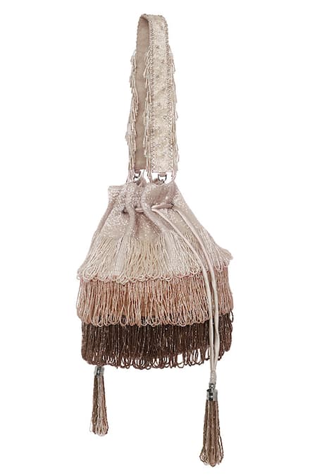 Multicolored bucket potli bag featuring all-over Japanese glass bead tassels in a shaded effect