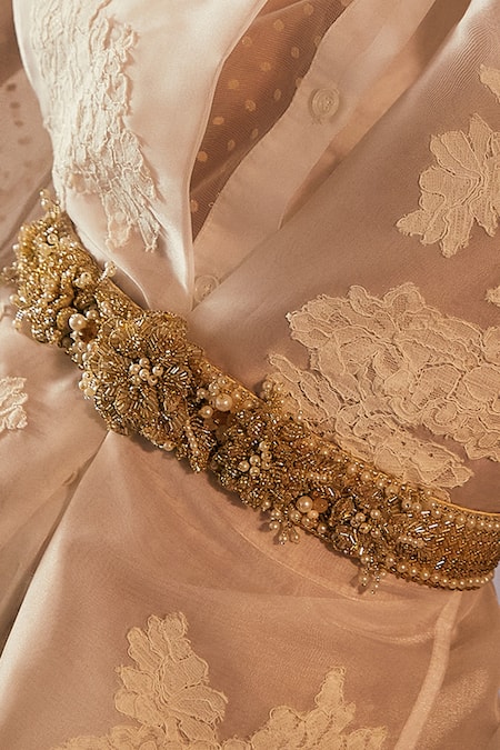 Gold belt featuring floral motif embellishment with crystals, rhinestones, and semi-precious stones