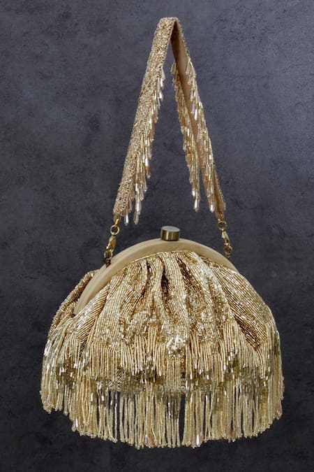 Gold Crystals, Beads, Tassels Firante Soft Pouch With Handle