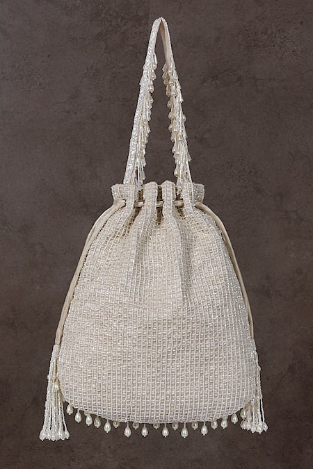 Ivory potli bag featuring hand embroidered baroque pearls, Japanese micro beads, and crystals. Comes with a detachable handle enhanced with lustrous micro beads, crystals, and diamante embellishments.