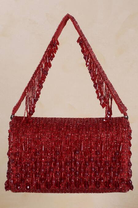 Carnelian red flap clutch featuring hand embroidered semi-precious gems, Japanese micro beads, and crystals in an ombre pattern. Comes with a detachable handle enhanced with lustrous micro beads, crystals, and diamante.