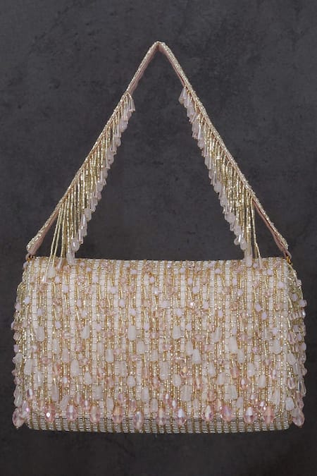 Rose quartz pink rectangular-shaped flap clutch featuring hand embroidered semi-precious gems, Japanese micro beads & crystals in an ombre pattern. Comes with a detachable handle enhanced with lustrous micro beads, crystals and diamante.