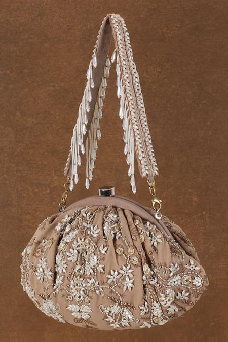 Beige Crystals, Pearls, Beads Siah Floral Kundan Embellished Clutch