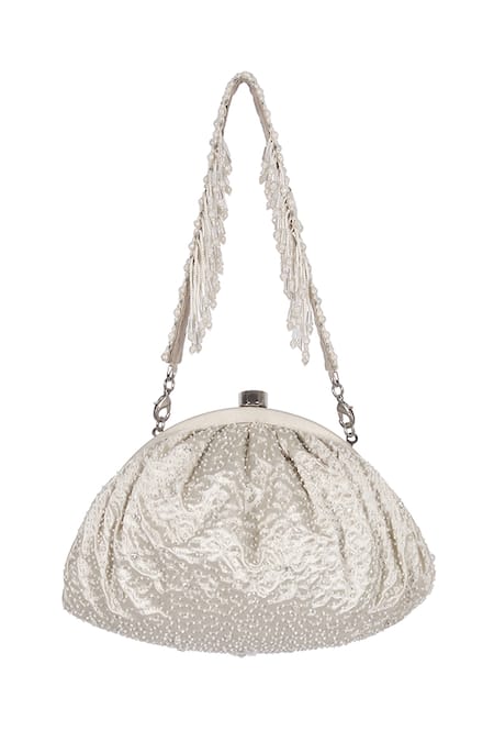 Ivory soft pouch featuring hand-embroidered Japanese beads, freshwater baroque pearls, and rhinestones