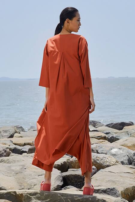 Rust orange low crotch draped pant featuring an elasticated waist and side pockets