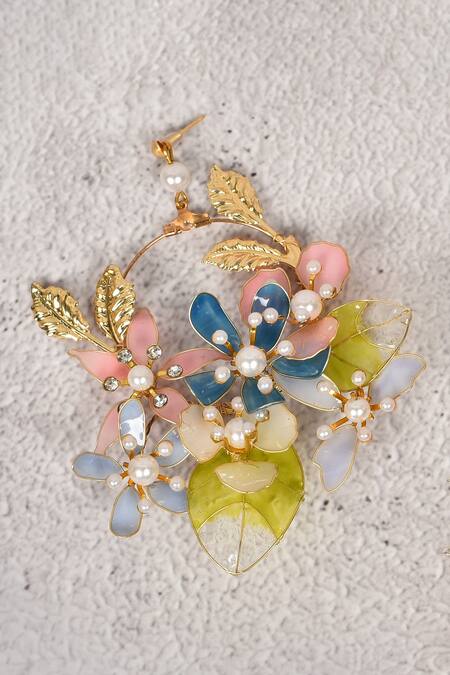 Gold plated & UV light hoop earrings in pastel multi colored floral motifs & stone embellishments.