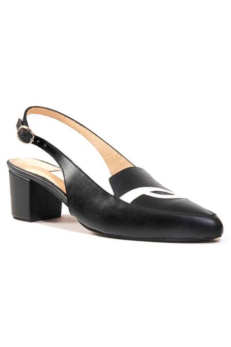 Black pointed toe block heels featuring a buckle closure