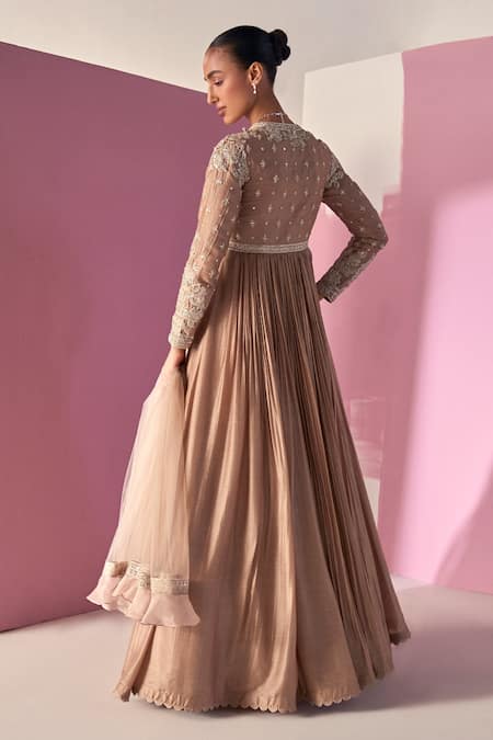 Buy_Ridhi Mehra_Beige Anarkali Fine Silk Maahrukh With Ruffled Hem Dupatta  _Online_at_Aza_Fashions