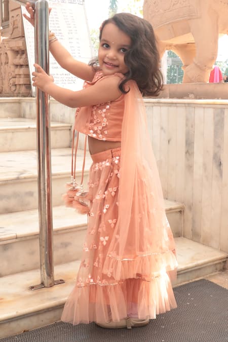 Brown lehenga featuring mirror work embroidered motifs with a frill hem. Paired with a mirror work top and an attached dupatta.