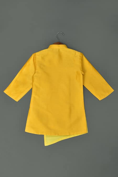 Yellow art silk sherwani featuring zardosi and stone embroidered feather motif. Paired with a white dhoti with elasticated waistline.