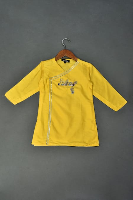 Yellow Cotton, Silk Embroidery Krishna And Flute Embellished Kurta Set