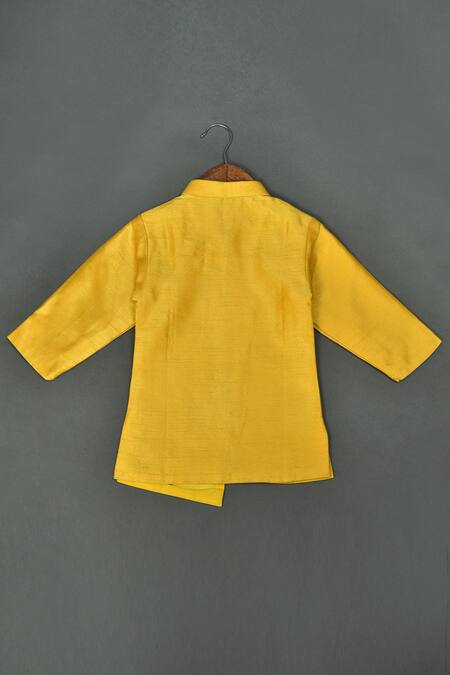 Yellow art silk sherwani featuring a zardosi embroidered lion motif and a mandarin collar. Paired with a white dhoti with an elasticated waistline.