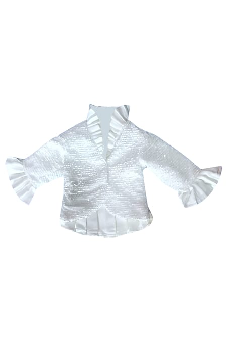 White top featuring sequin embroidery, high neck, and pleated frill sleeves. Paired with coordinating pants for a complete look.