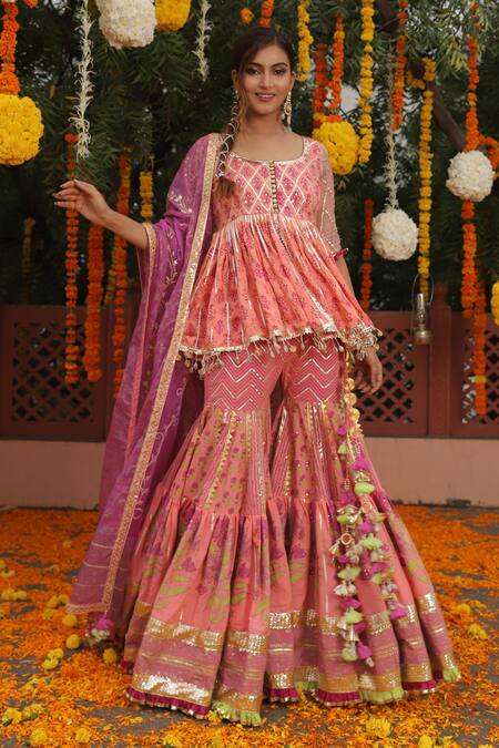 Pink peplum kurta with floral print, sequin & gota work. Paired with printed, embroidered sharara & tassel dupatta.