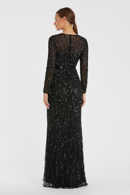 Black gown featuring a mesh overlay base with an illusion yoke and full sleeves