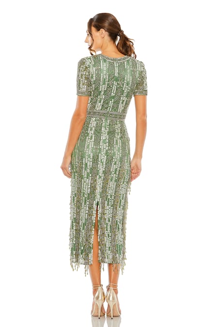 Green Net Embroidery, Sequins Brisa Embellished Crystal Fringe Column Dress
