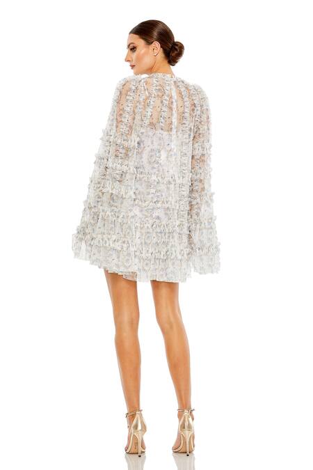 White dress featuring a ruffled high neck, long cape sleeves, and an all-over ditsy iris print