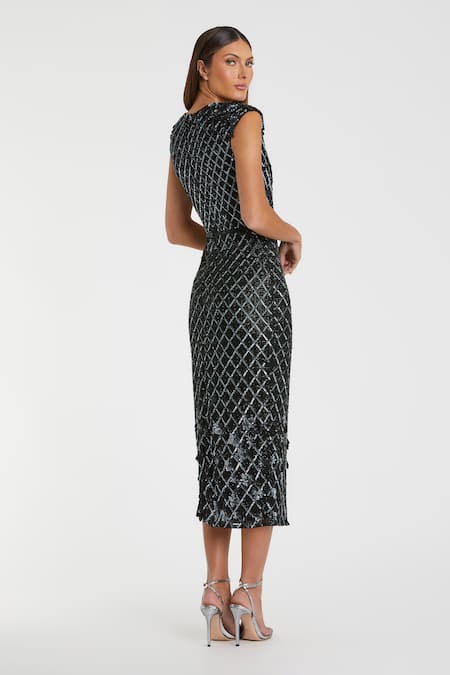 Black Polyester Sequins Round Neck Embellished Flora Midi Dress